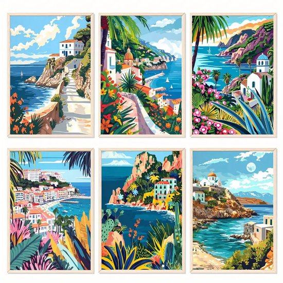 Met deze levendige schilderen-op-nummer set van FA-VE breng je de Mediterrane sfeer zo je huis in. Zes kleurrijke ontwerpen tonen idyllische dorpjes, rotskusten en zomerse luchten. Ideaal voor ontspanning of decoratie.