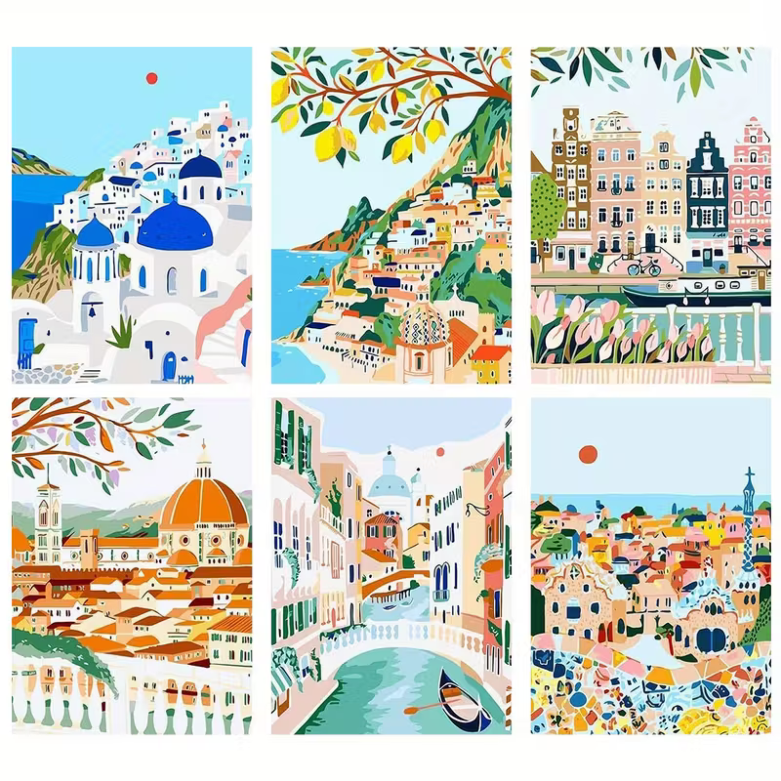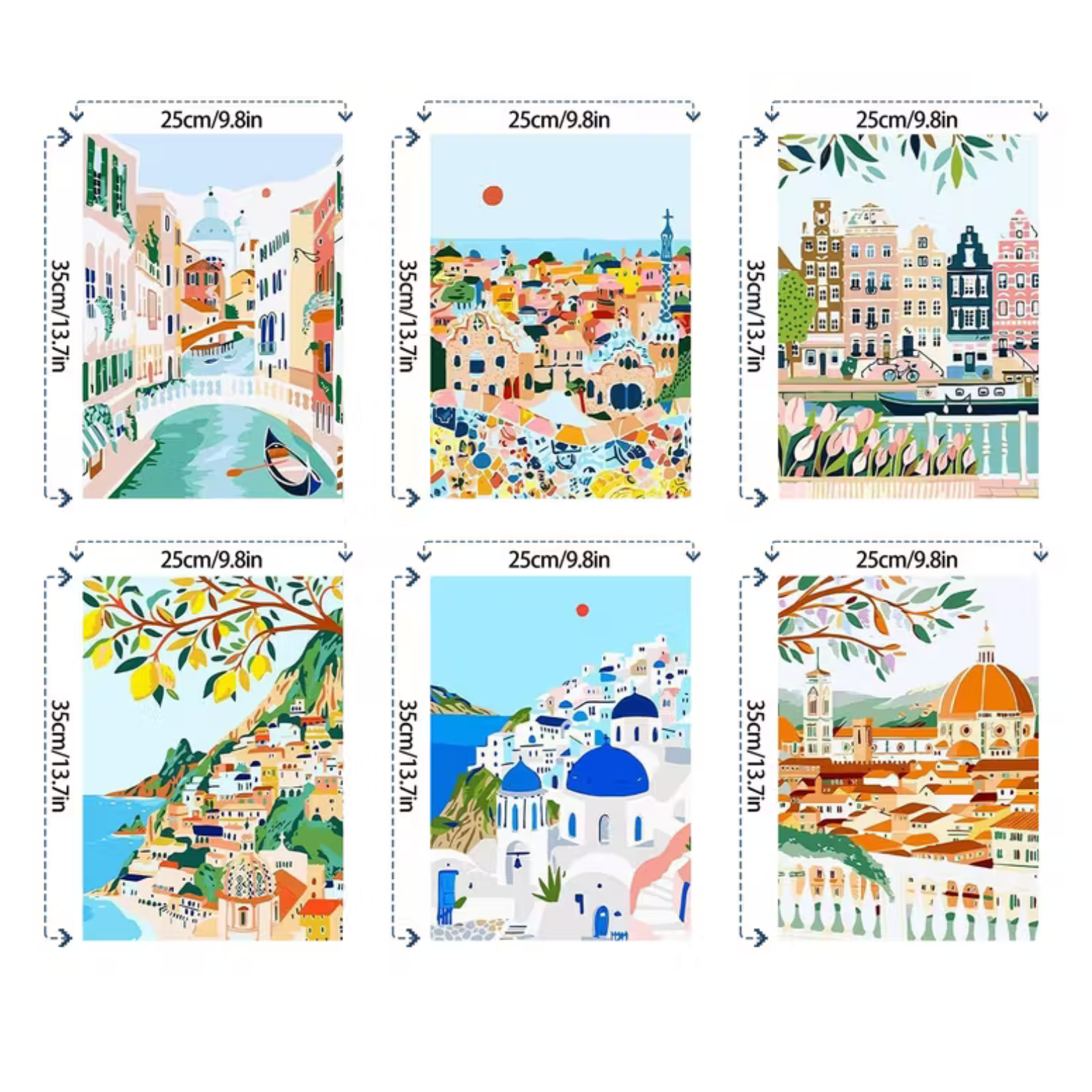 Ontdek de charme van wereldsteden terwijl je ontspant met deze complete FA-VE Schilderen op Nummer set. De set bevat 6 kleurrijke schilderijen van iconische bestemmingen zoals Venetië, Santorini, Amsterdam, Florence en meer. Elk doek meet 25x35 cm – perfect om in korte tijd prachtige resultaten te behalen.